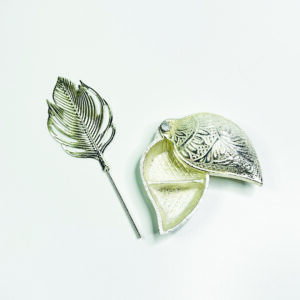 Silver Bell and Diya Set with Decorative Feather Handle in Wooden Gift Box, Traditional Pooja Accessories